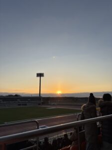 毎年ギオンスタジアムのスタンドから初日の出を拝み、近所の氏神様に初詣をします。